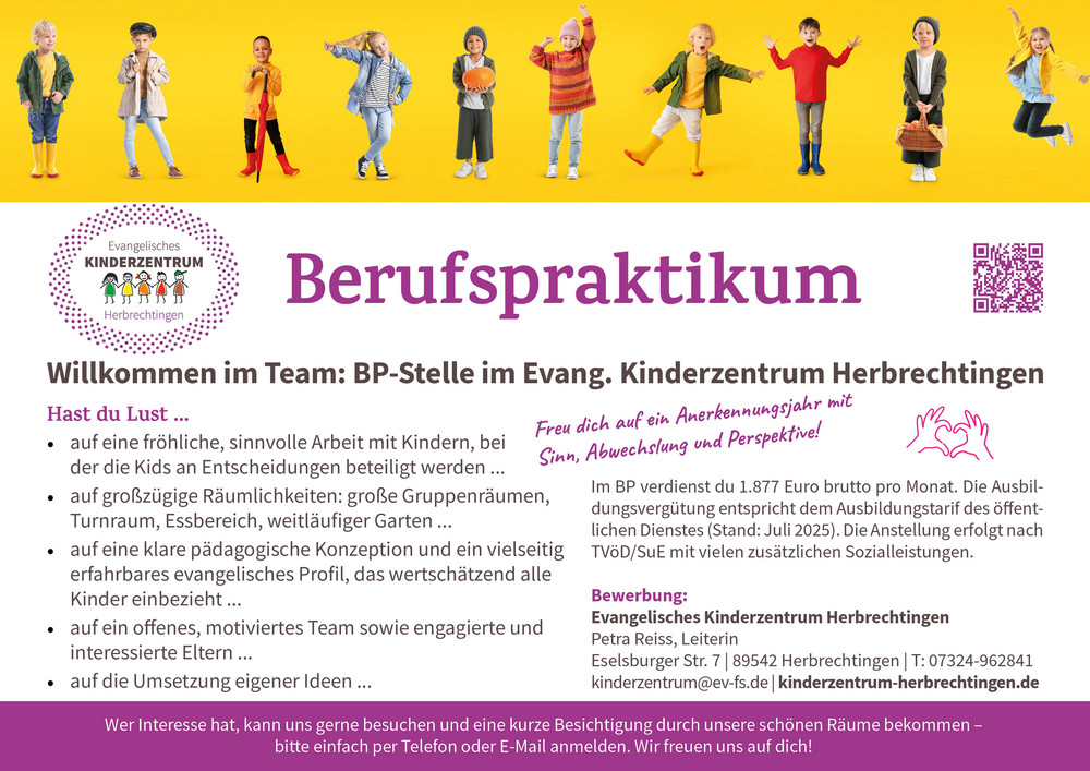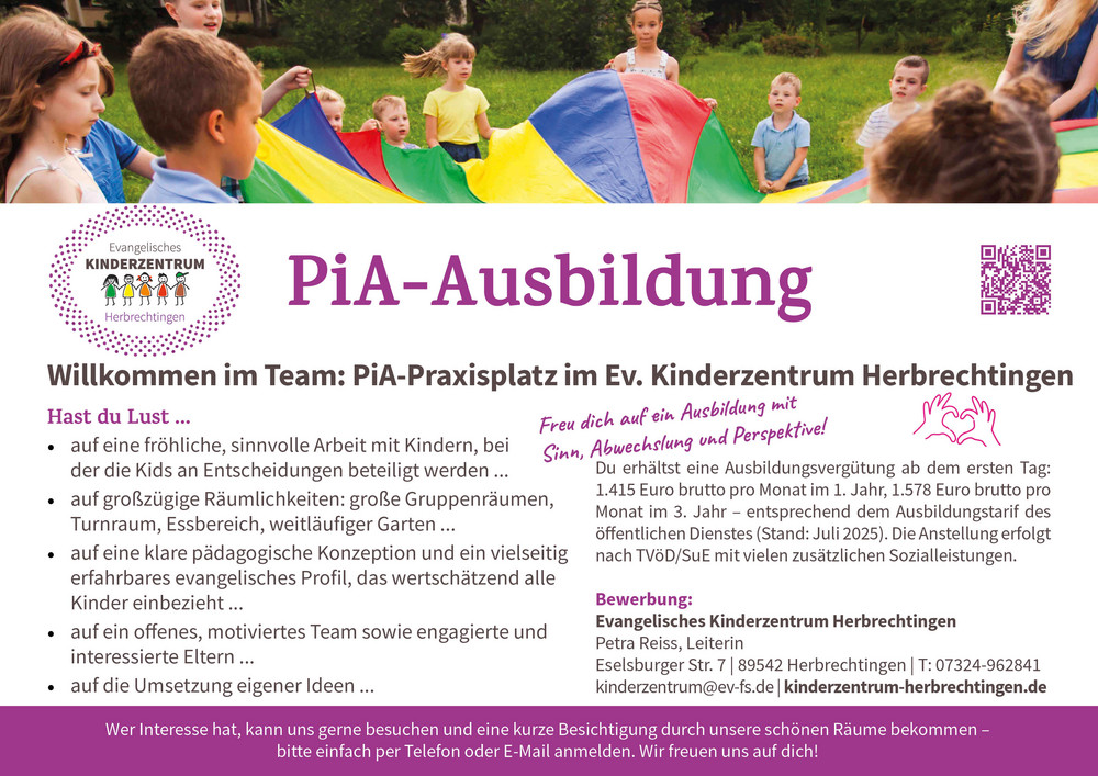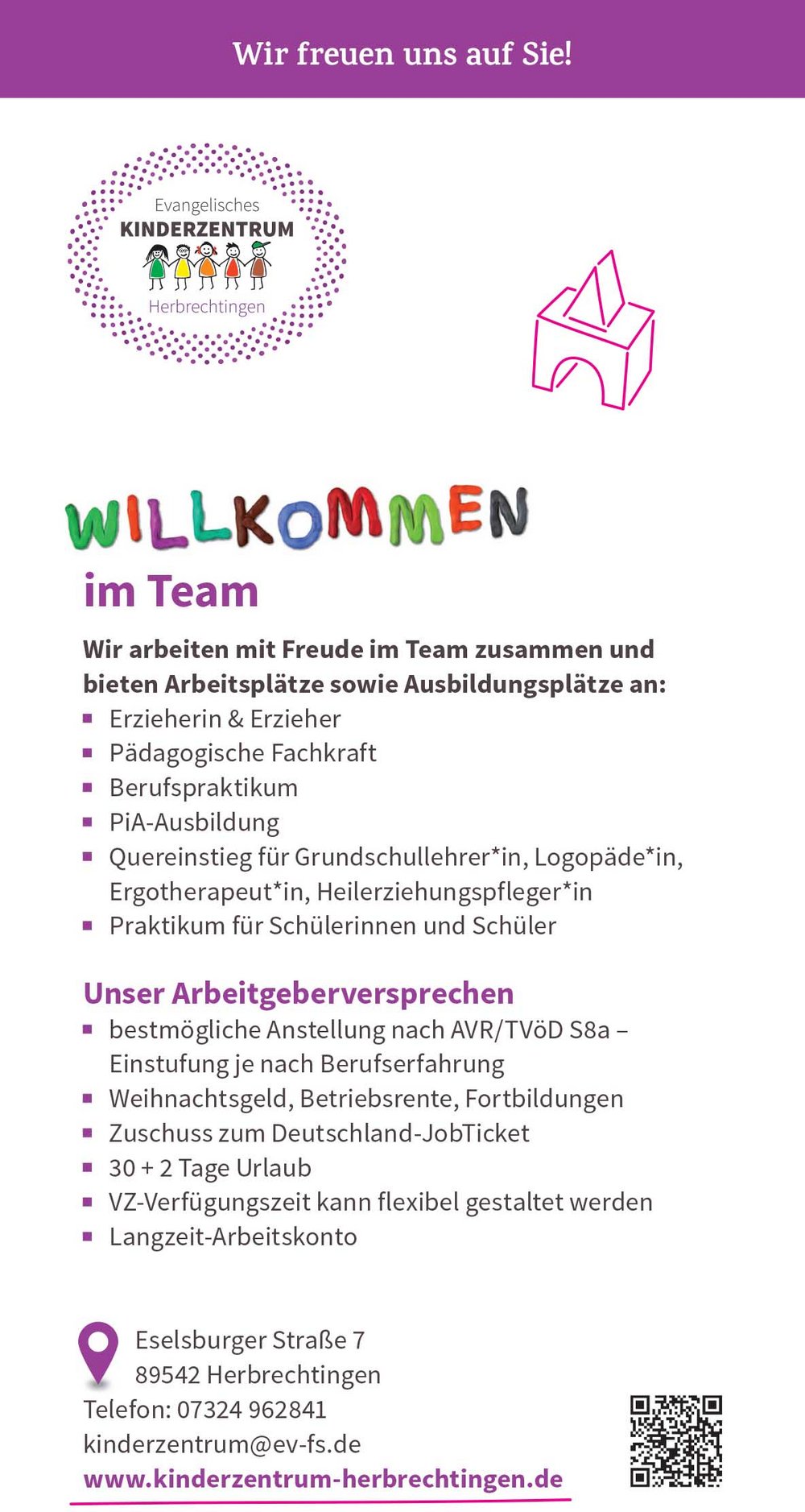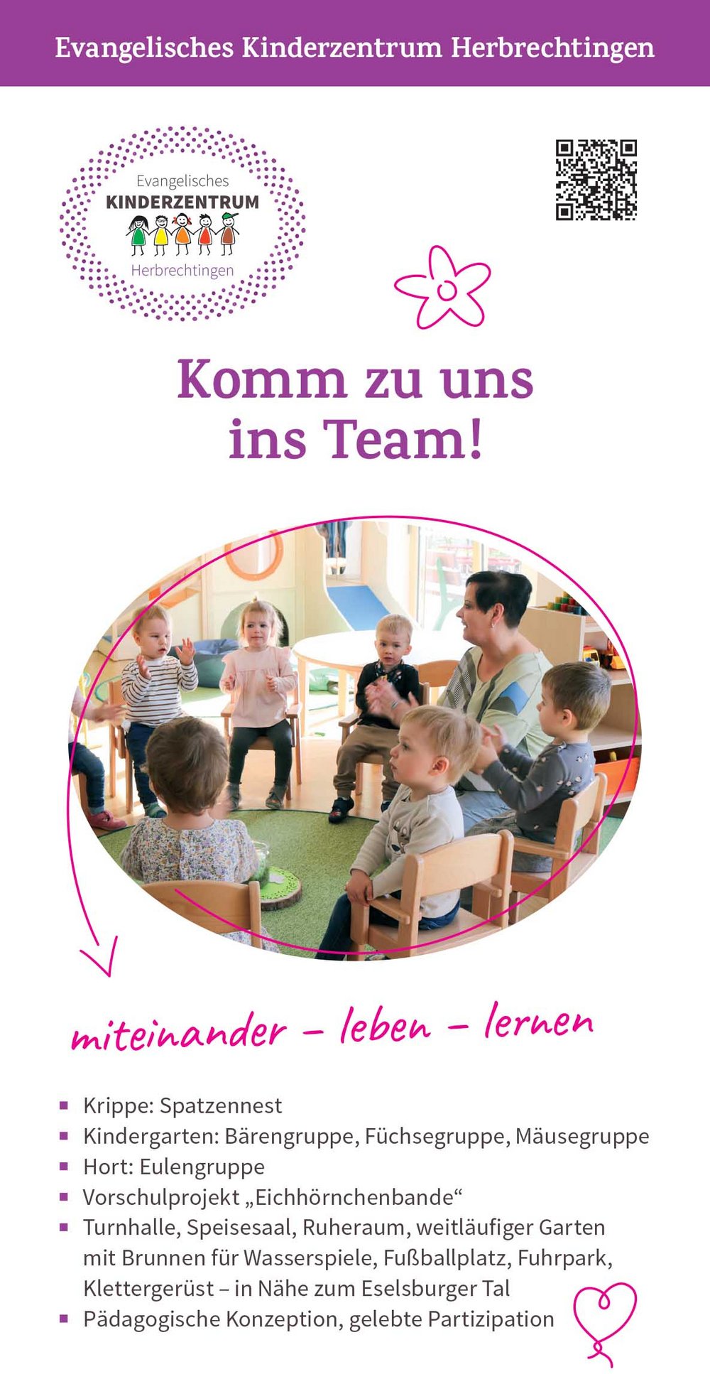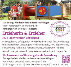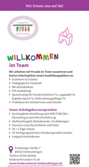 Das Evangelische Kinderzentrum Herbrechtingen mit Krippe, Kindergarten und Hort sucht ab sofort Verstärkung: